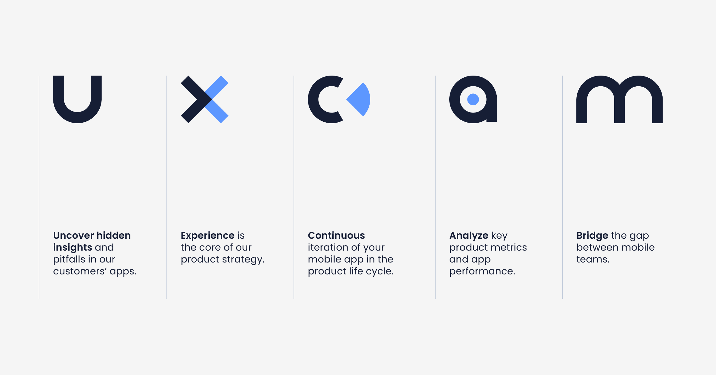 As our vision is to provide positive and effortless mobile app experiences, we wanted the logo to also look effortless, simple and professional. The sky blue and the contrasting gray in the “X” represent our unique intersection — we give transparent insights to mobile teams and are helping them move forward together.