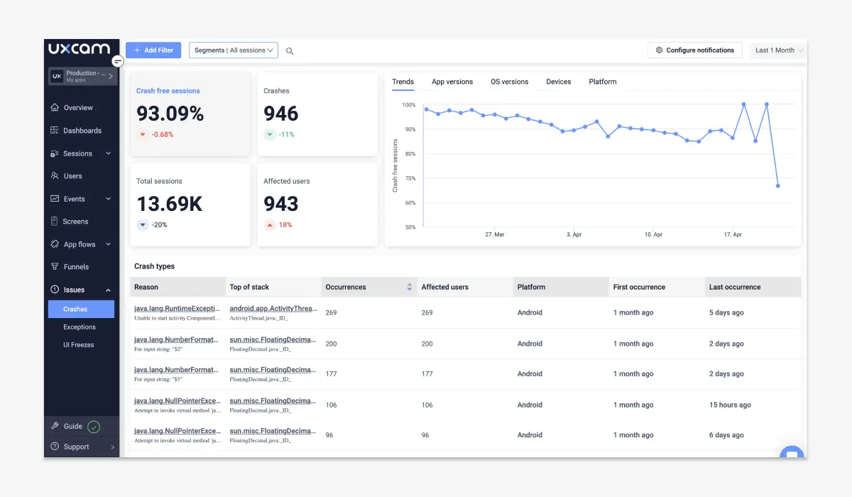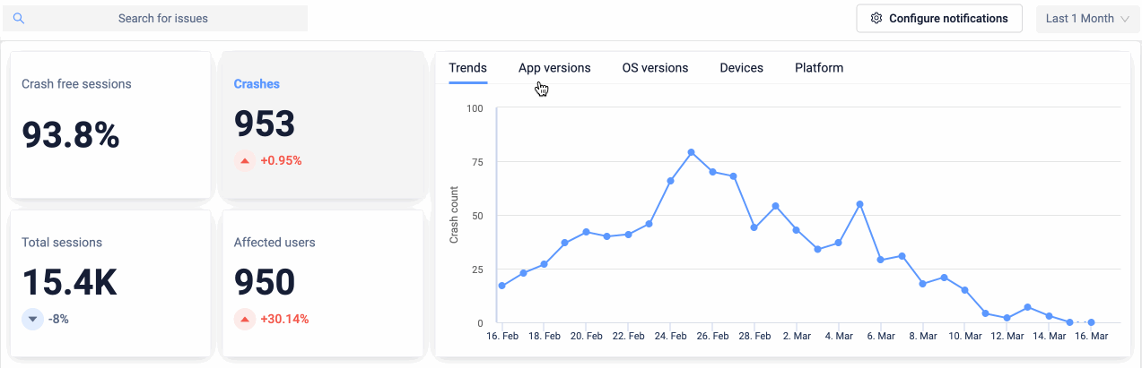 Continuous improvement: Historical data about app crashes over time helps teams identify trends and patterns. Use these insights to continuously improve your app's stability and performance through iterative updates and bug fixes