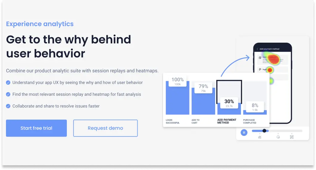 If you're looking to improve the user experience of your mobile app, then UXCam is a fantastic solution to consider. As a leader in mobile app analytics, UXCam can provide valuable insights into user behavior, allowing you to identify pain points and optimize the user experience for maximum engagement and retention. So if you're ready to take your mobile app to the next level, try UXCam. With a range of powerful analytics features like touch heatmaps, funnel analytics, session replay, customizable dashboards, and a user-friendly interface, UXCam is the perfect tool for optimizing your app's user experience. Schedule a demo today and see how we can help you create an app that truly meets the needs of your target audience.