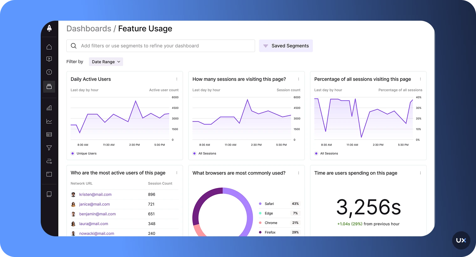 Issue analytics: Detect errors, rage clicks, and performance problems in real time.