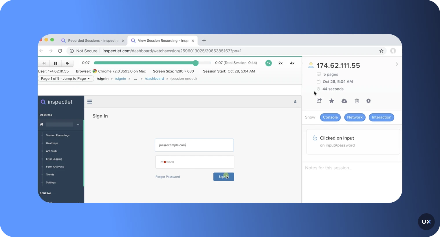 Inspectlet covers classic, click, and scroll heatmap data visualizations. It is a straightforward tool that focuses on combining heatmaps with session recording, A/B testing, and robust error logging. Inspectlet tracks mouse movements, which it correlates with eye movements, to see where visitors are paying attention.