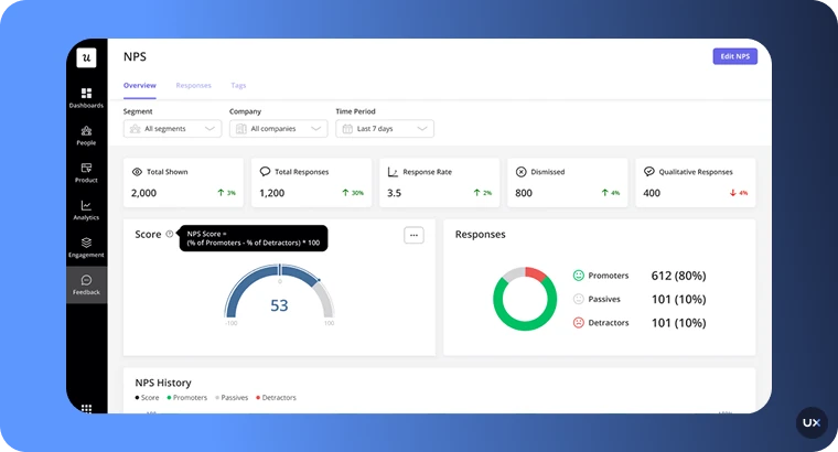 Feedback and NPS surveys: Collect user sentiment, feedback, and feature requests directly within the product.