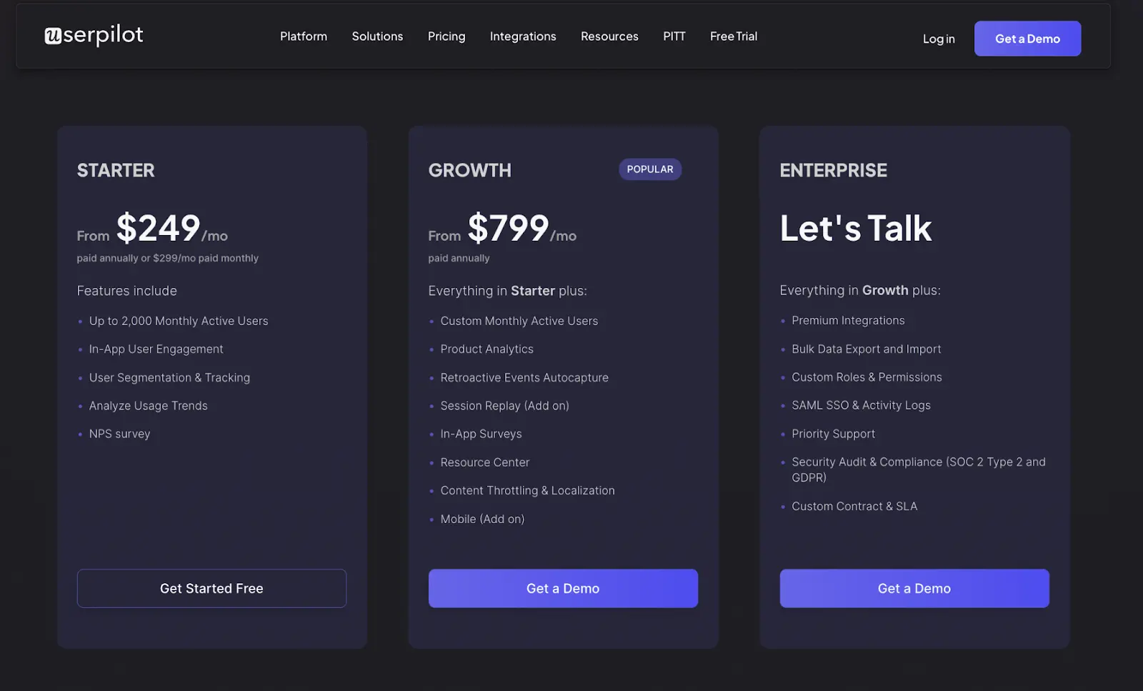 Userpilot offers three main pricing tiers: Traction, Growth, and Enterprise. Mobile onboarding is available as an add-on starting with the Growth plan, which begins at $799 per month when billed annually. The Growth plan includes advanced features like autocapture, in-app surveys, and product analytics.