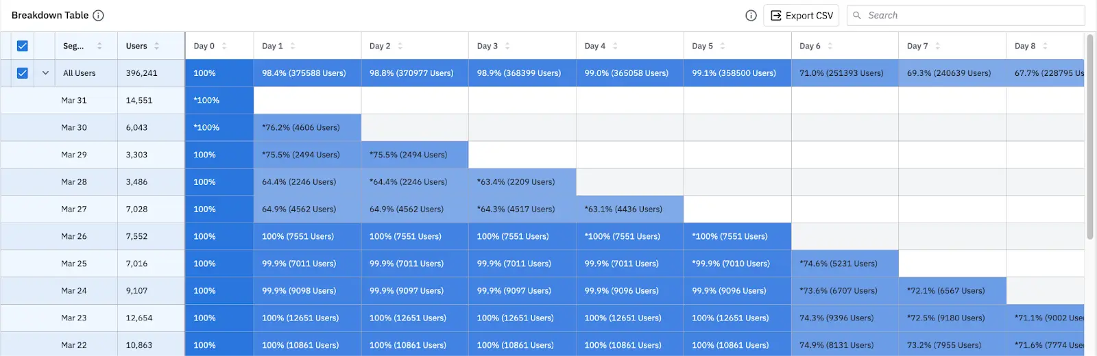 Cohort analysis: Our cohort analysis functionality makes it easy to examine cohorts and quickly identify retention patterns using color and tables.