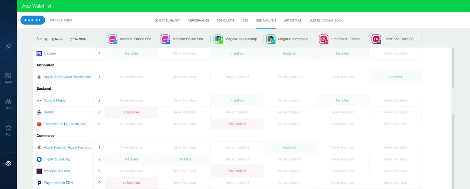 This provides insight into your competitors’ tech stacks. You can use it to track which SDKs they’ve integrated, which ones they’ve removed, and which ones they’ve never installed. What’s more, the SDKs are separated by category to help you understand their purpose without any extra Googling.