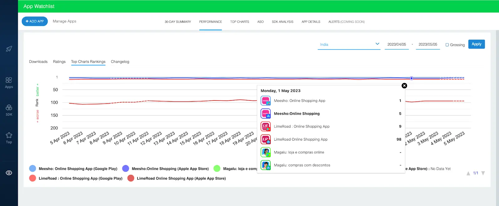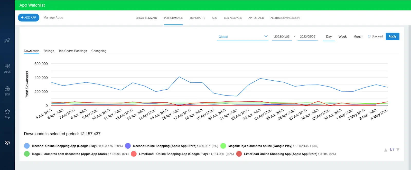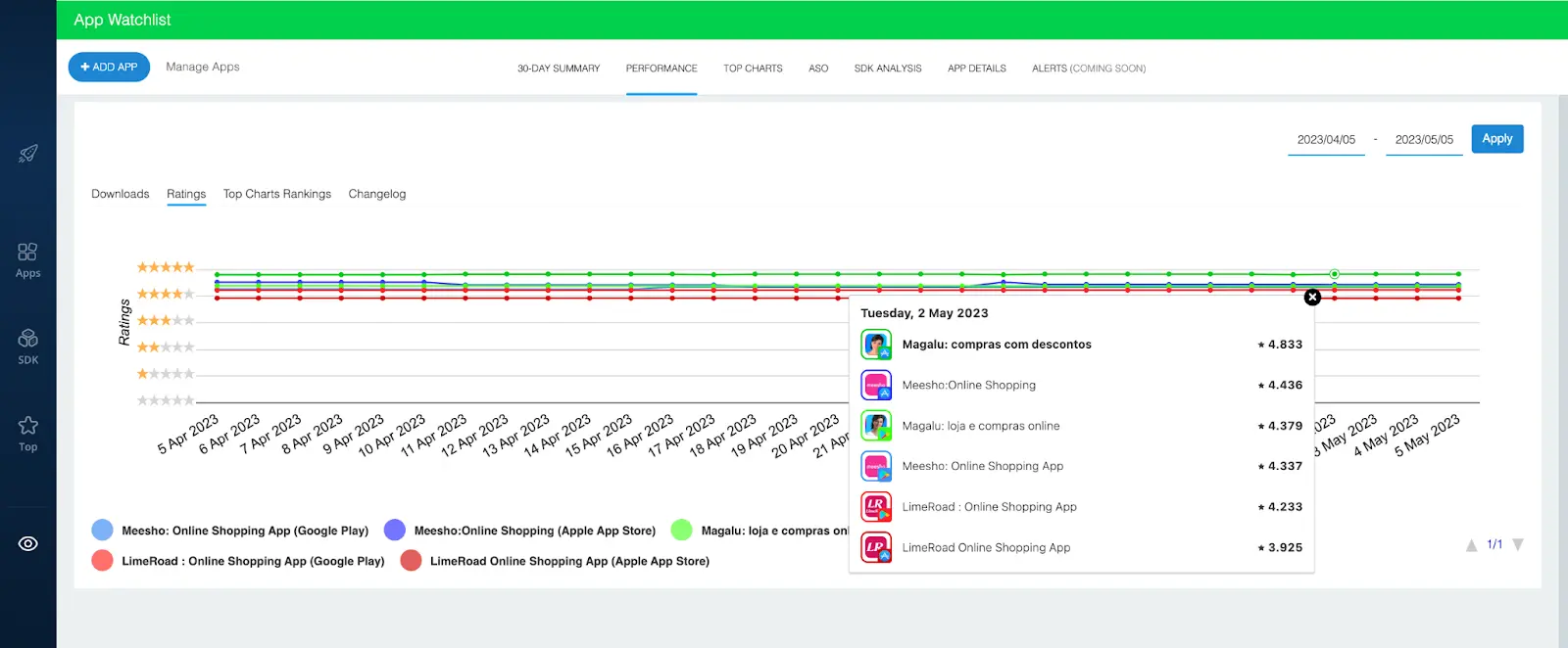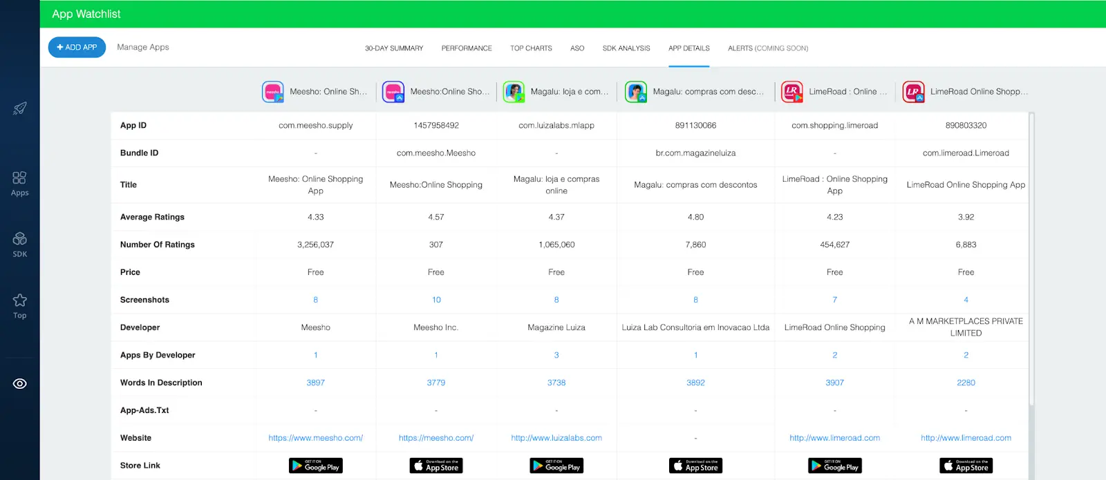 In the example above, we’ve added the iOS and Android versions of three shopping apps: Meesho, Magalu, and LimeRoad.