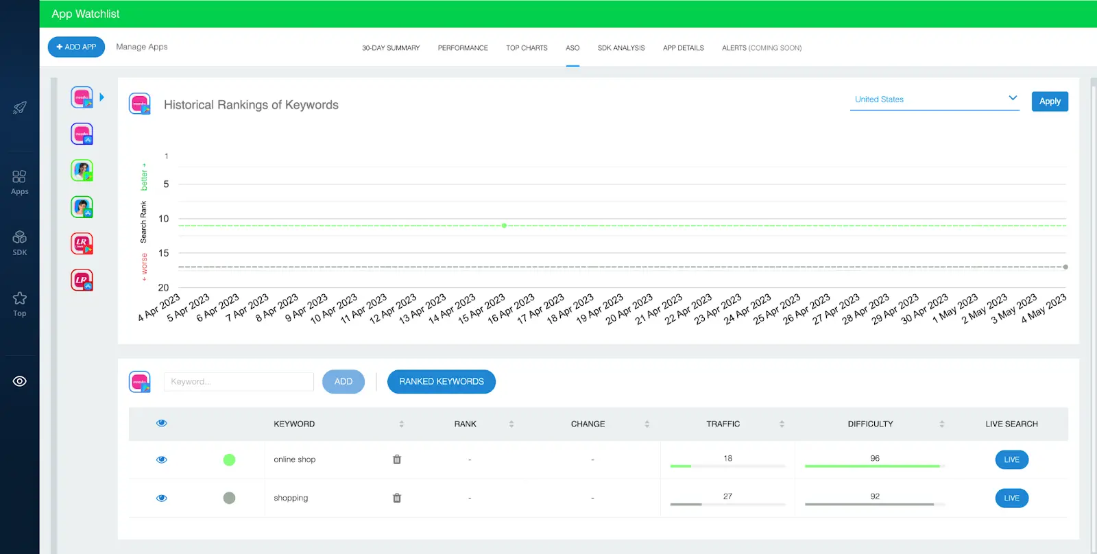 The “ASO” dashboard comes with a ranked keyword feature that helps you discover all the keywords your competitors’ apps rank for. Likewise, you can use it to track and compare keyword rankings over time and gain insight into things like keyword traffic metrics, ranking changes, and ranking difficulty. Moreover, the App Watchlist’s keyword Live Search feature enables you to see live rankings for any of the keywords you follow.