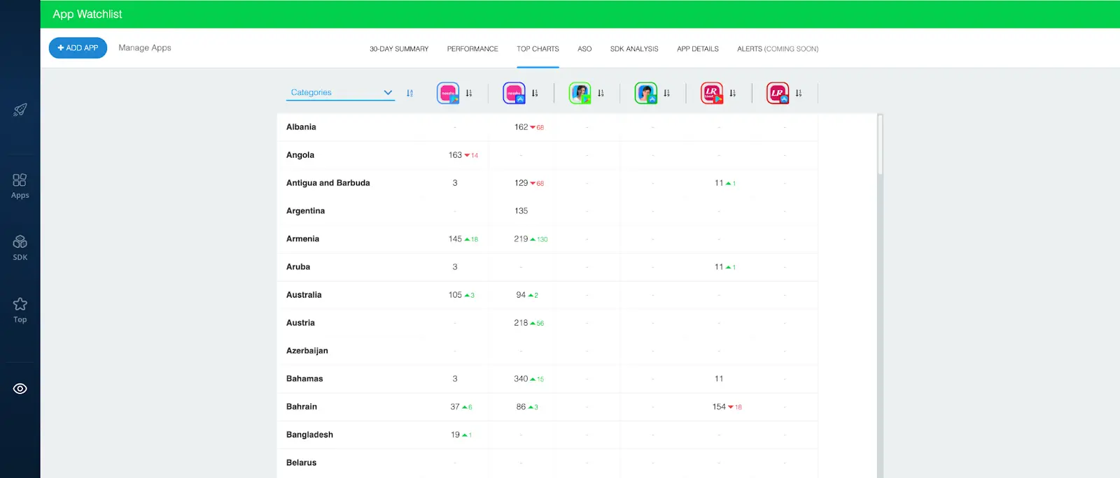 The 42matters App Watchlist lets you track global top chart rankings by country and category. As you can see in the image above, it shows you how each of the apps you monitor are currently performing across the globe, with an indicator showing you how the current ranking compares to that of the previous day.