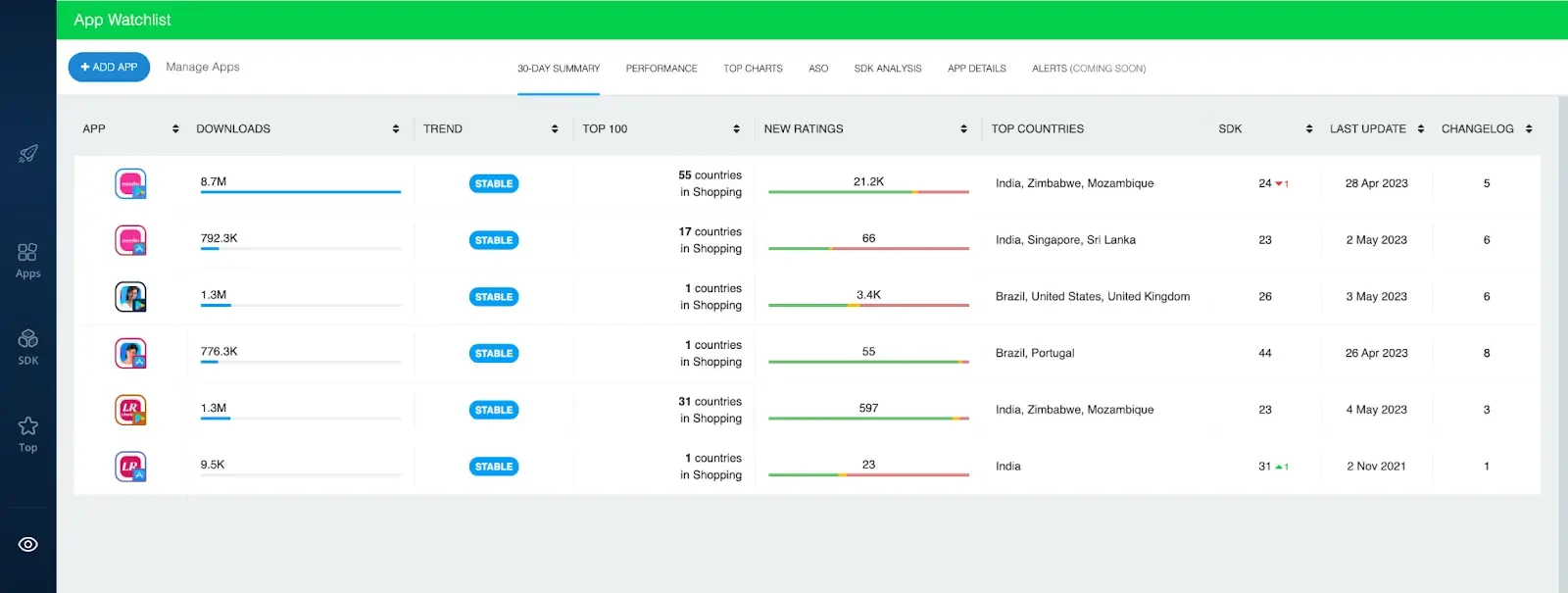 With the “30-Day App Summary” dashboard, you can track and compare downloads, top chart performance, new ratings, top countries, SDK count, changelog updates, and more. This will help you spot in near real-time when competitor apps begin to trend, where they’re having the most success, and whether or not they’ve been fine-tuning their app.