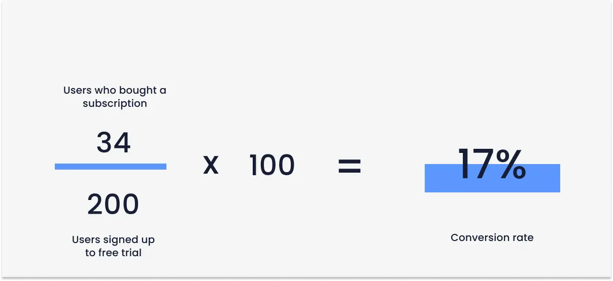 Conversion rate calculation is straightforward. It's the number of users performing a particular action, then dividing it by the number of users. For example, if 34 out of 200 user who signed up for a free trial purchased a premium subscription this month, you would divide the number of users who performed the action by your total users; here's how: