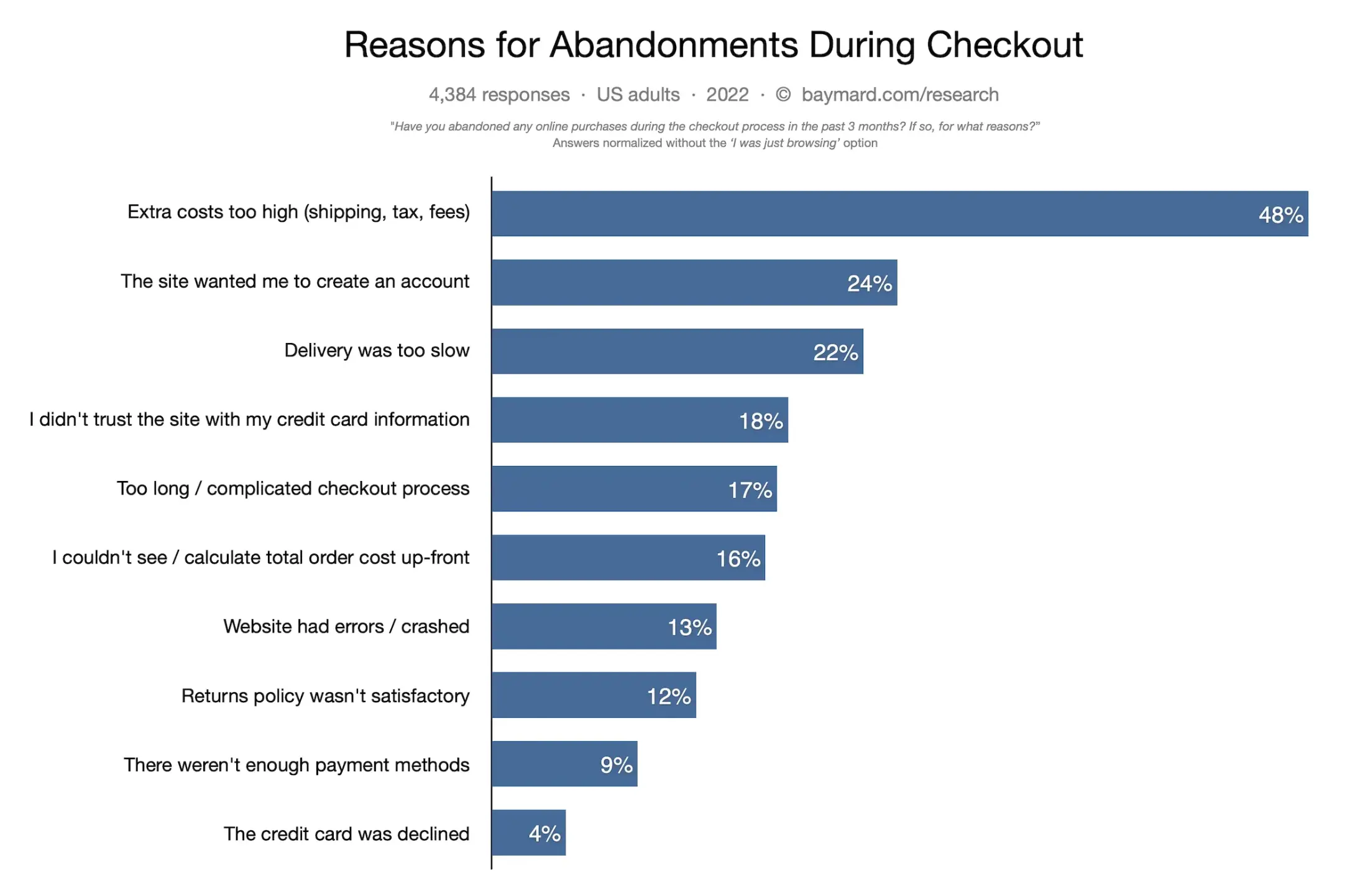 According to research, 17% of consumers abandon their shopping carts due to a long or complicated checkout process. And here are some other reasons for app abandonment: