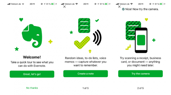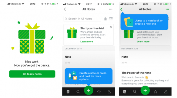 Evernote provides a great example of simple progressive user onboarding. It guides the users through every offered function.