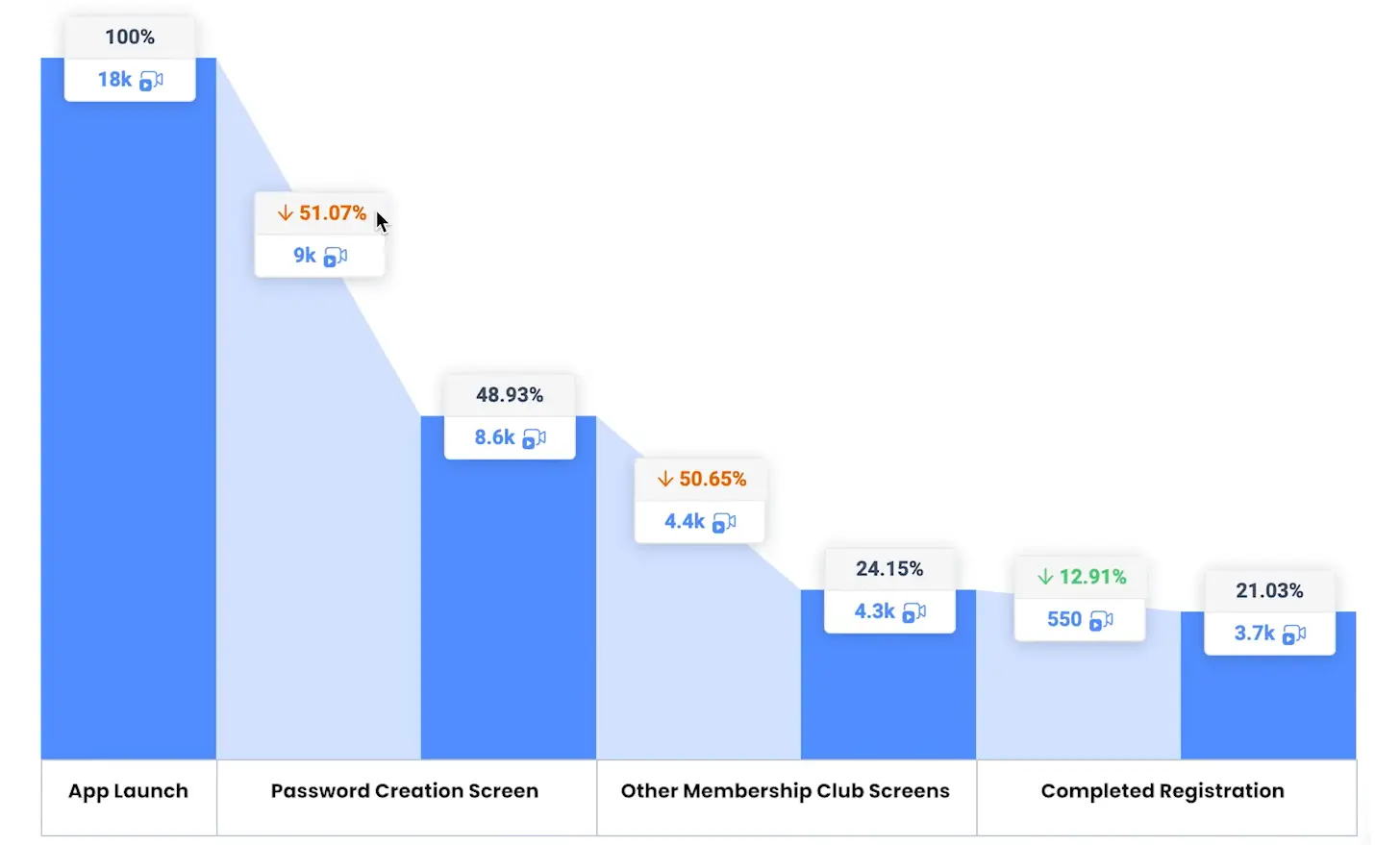 Costa Coffee’s product team turned to UXCam for insights into why users were struggling with the registration process. The team set up custom events to track all key stages in the registration process and added these events to funnels for a visual overview of how users sign up for the Costa Coffee loyalty program.