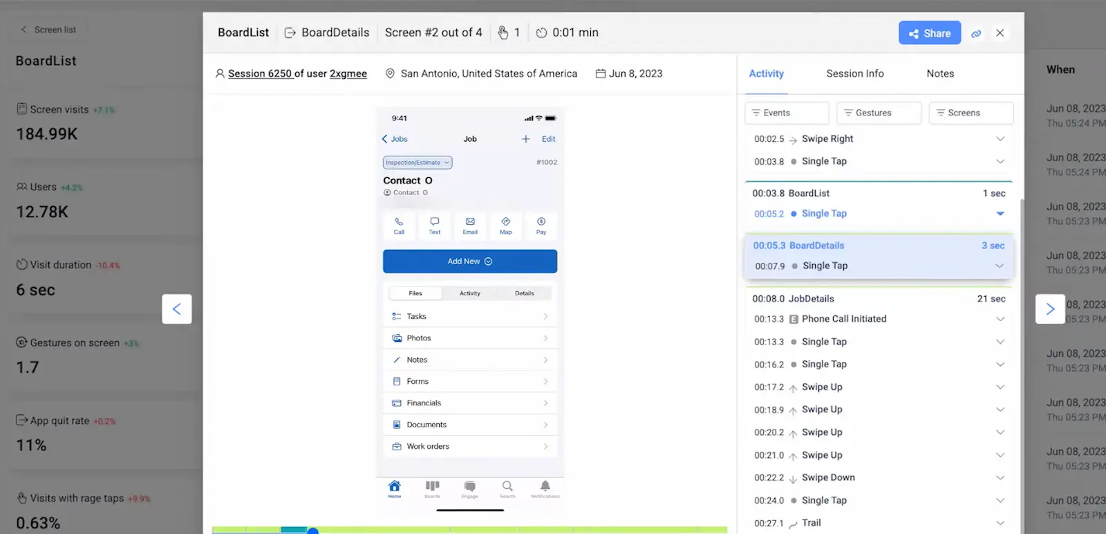JobNimbus leveraged UXCam's comprehensive mobile app analytics capabilities to track various metrics and make data-driven decisions:
