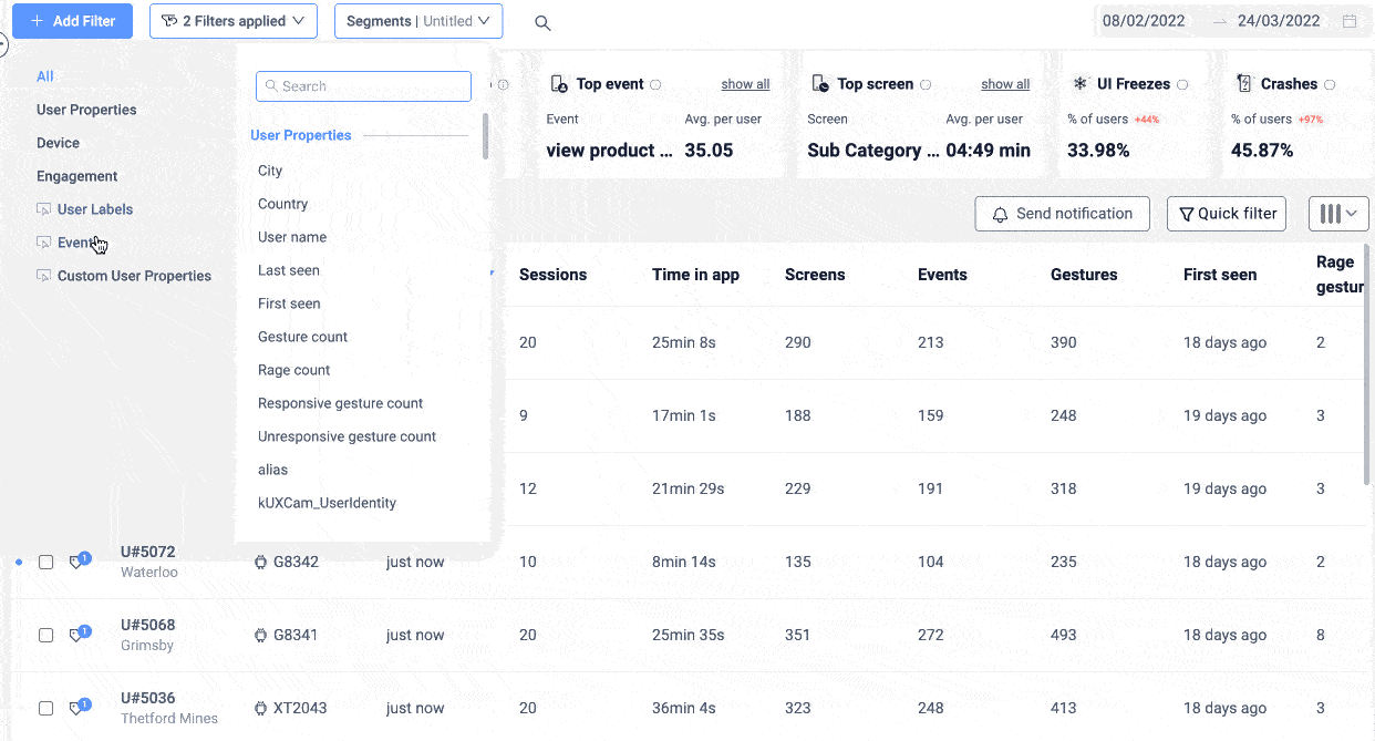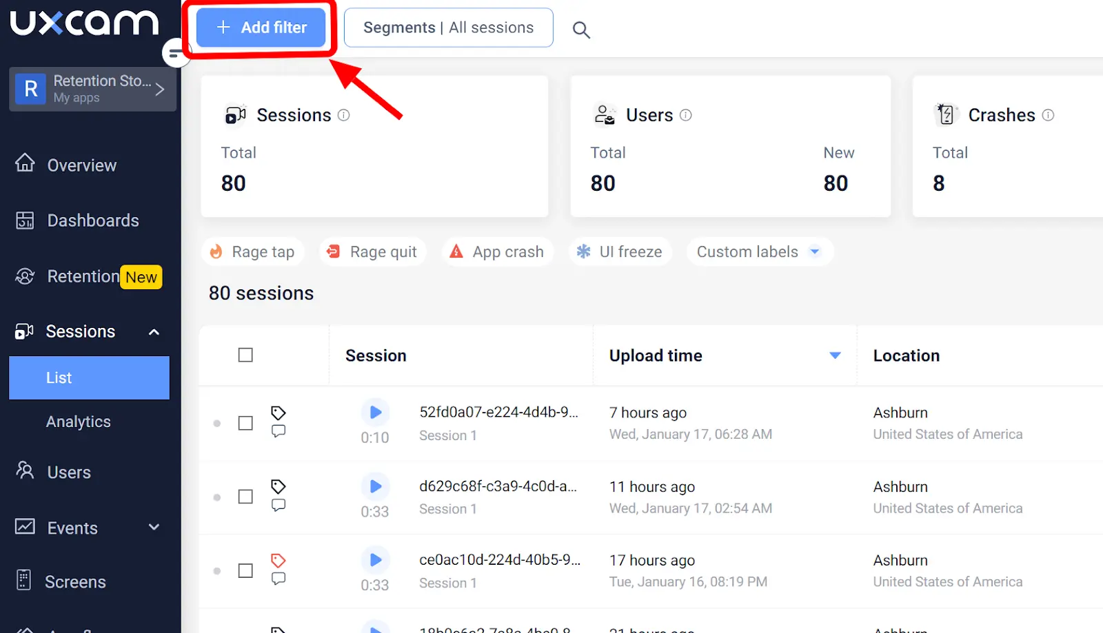 You can create segments in UXCam from any screen or feature—just click the ‘Add Filter’ button and choose any user property, event, or UX issue. Then click ‘Save Segment’ to save the filter for future use.