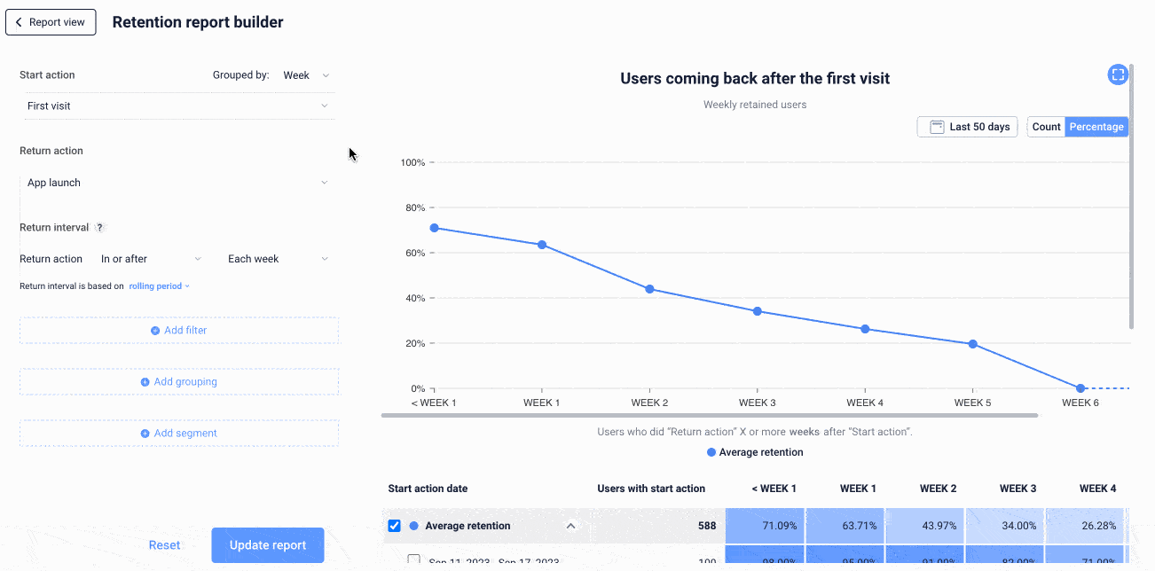 There, you’ll be able to create customizable retention reports that offer week-by-week insights into retention rates.