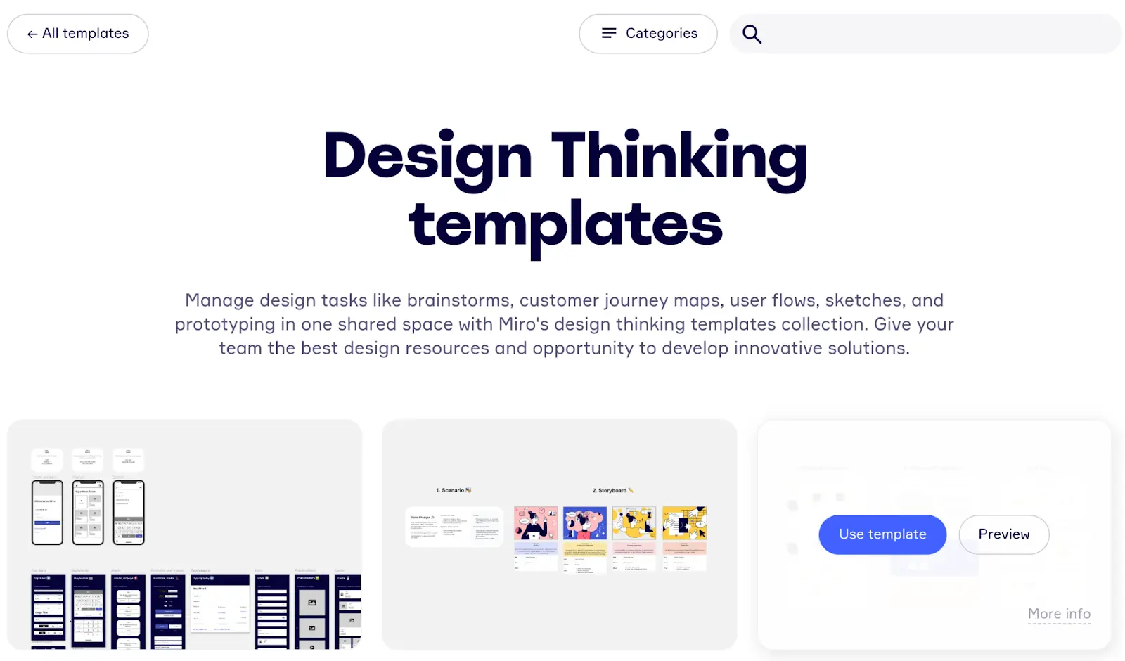 Design Thinking Templates: Use the design thinking templates collection to centrally manage your user flows, journey mapping, brainstorming ideas, and all design tasks.