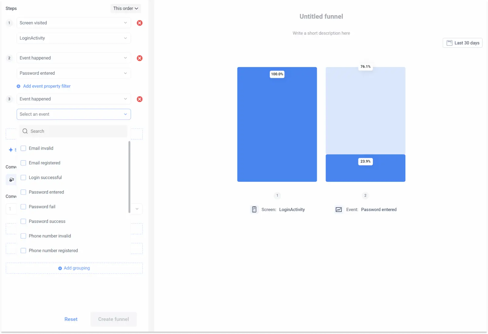 Start by setting up the funnel you want to track in your analytics tool. With UXCam, this process is simple. Every in-app interaction is automatically tracked using tagless auto-capture, so all you need to do is define interesting events and screens and select them as funnel stages.