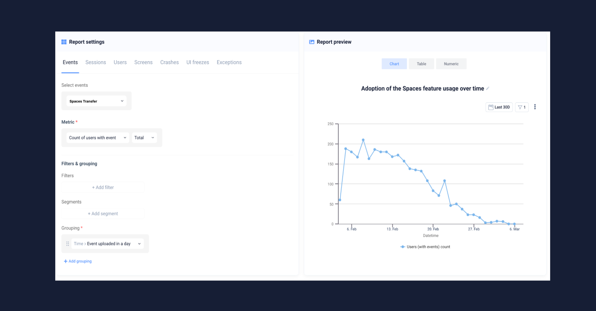 However, in case you want to be more precise about tracking the adoption of a specific feature like spaces, custom events will help you to have a more precise view of users who successfully set up spaces, or interacted with the feature.