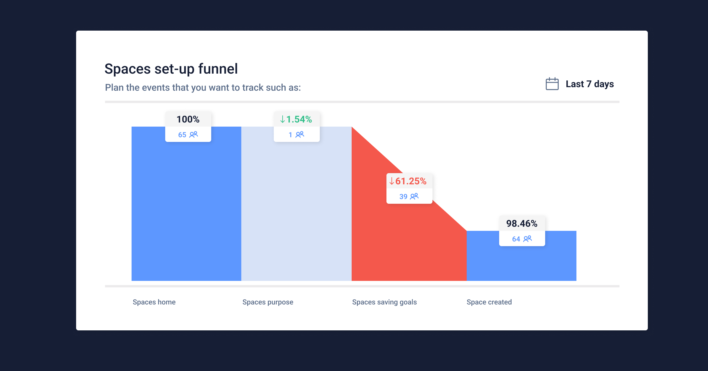 Let’s say you want to investigate why users aren’t engaging with a new feature in your app. The purpose of the new feature is to allow users to create separate Spaces, but not necessarily create savings accounts.