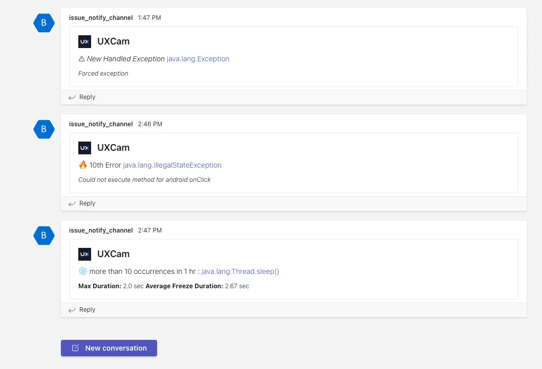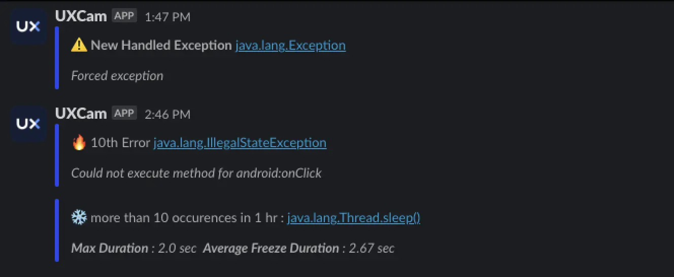 UXCam’s inbuilt notification system alerts development and product management teams to technical issues like app crashes, UI freezes, and handled exceptions. You can set up instant notifications for Slack and Microsoft Teams.