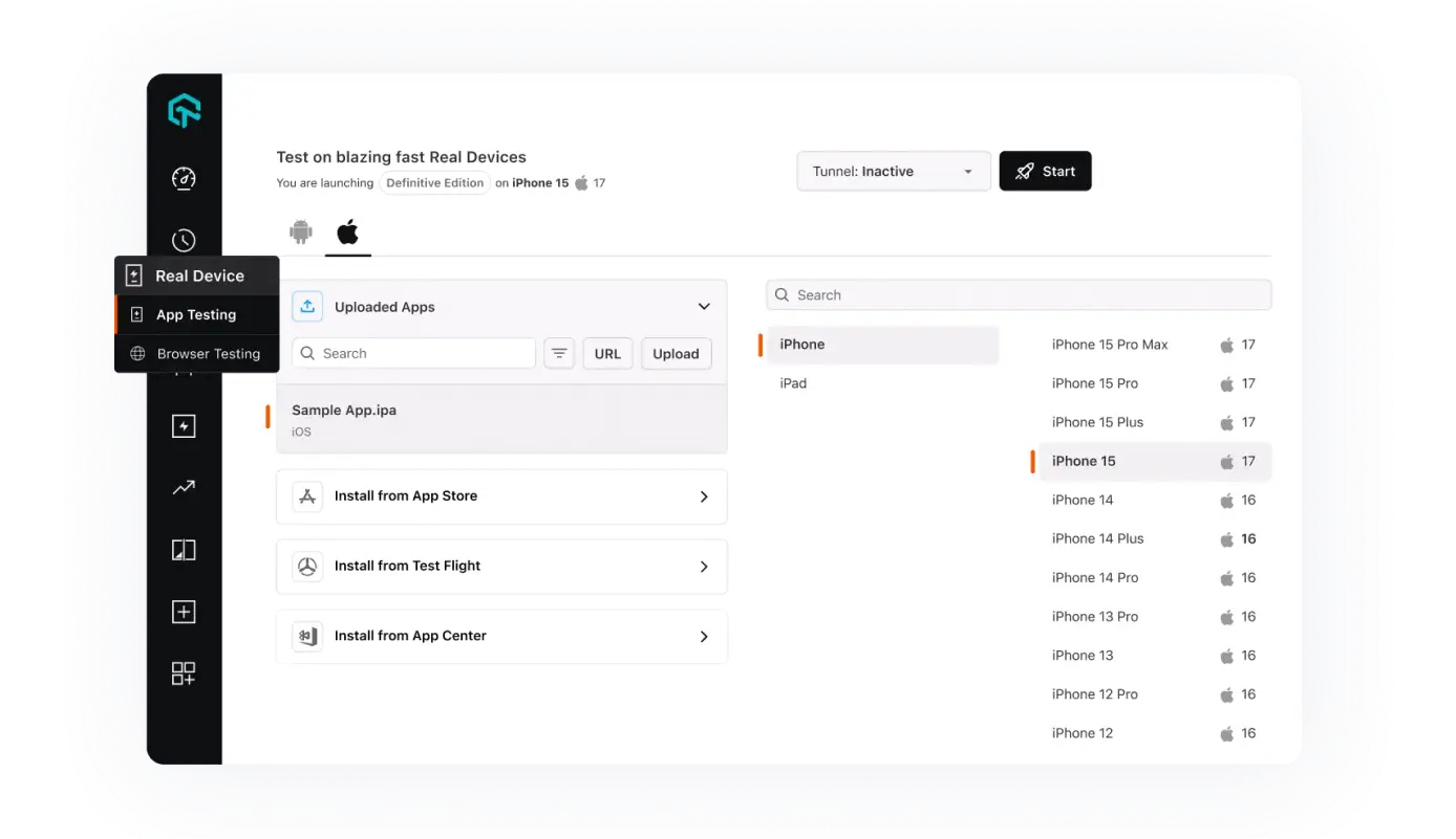Real Device Testing: Provides access to a large pool of real Android and iOS devices for accurate testing.