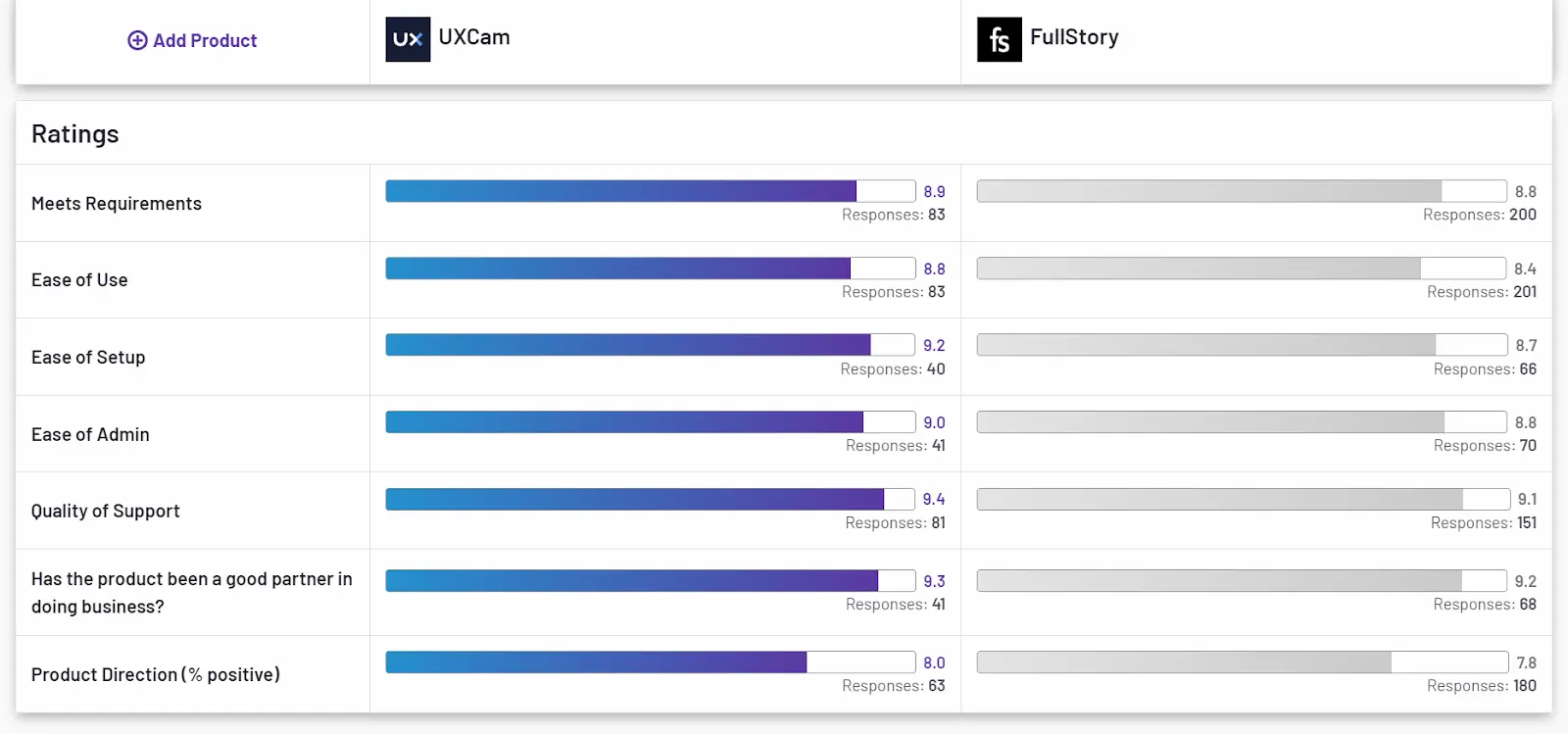 UXCam outperforms FullStory in every category tracked—from “ease of setup” to “product direction”. As a result, UXCam has an average rating of 4.7/5 compared to 4.5/5 for FullStory.