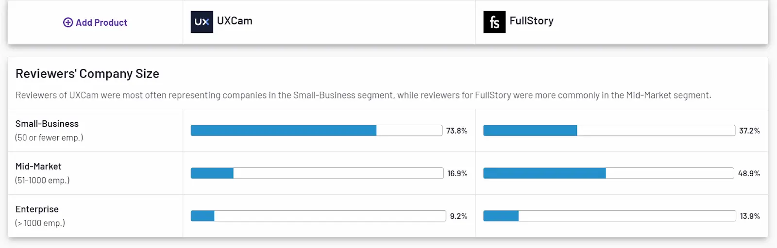 UXCam is more popular with the small-businesses segment (≤50 employees), while FullStory is more popular with the mid-market segment (51–1,000 employees).