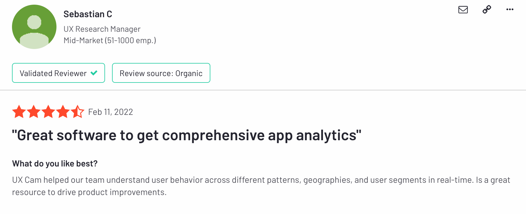 We've also become a newly minted Leader in the Mobile App Analytics category, a jump from our previous ranking as a High Performer. Review site G2 rates products and vendors based on reviews gathered from their user community and data aggregated from online sources and social networks.