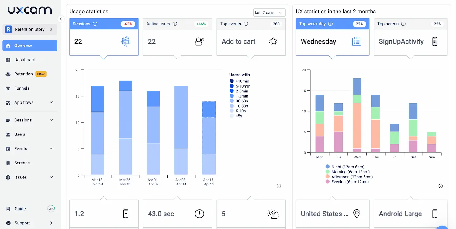 At UXCam, we understand that budget is a major consideration for businesses of all sizes. That’s why we offer flexible pricing plans and a variety of features to fit your needs. Our user monitoring, mobile heatmaps, and session replay tools give you valuable insights into how users interact with your app so you can make data-driven decisions to improve the user experience.