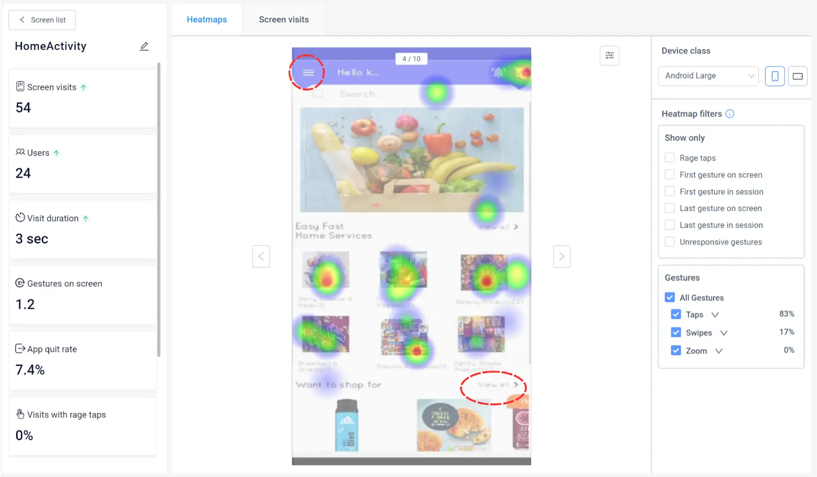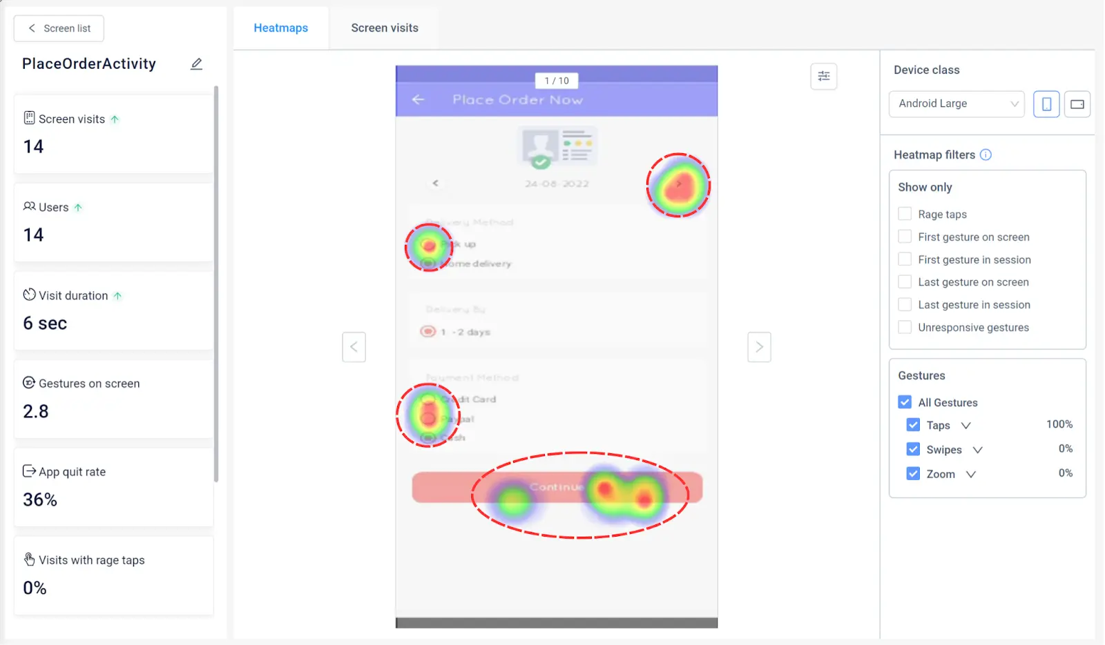 In the image below, we’re looking at a heatmap of rage taps on an app screen.