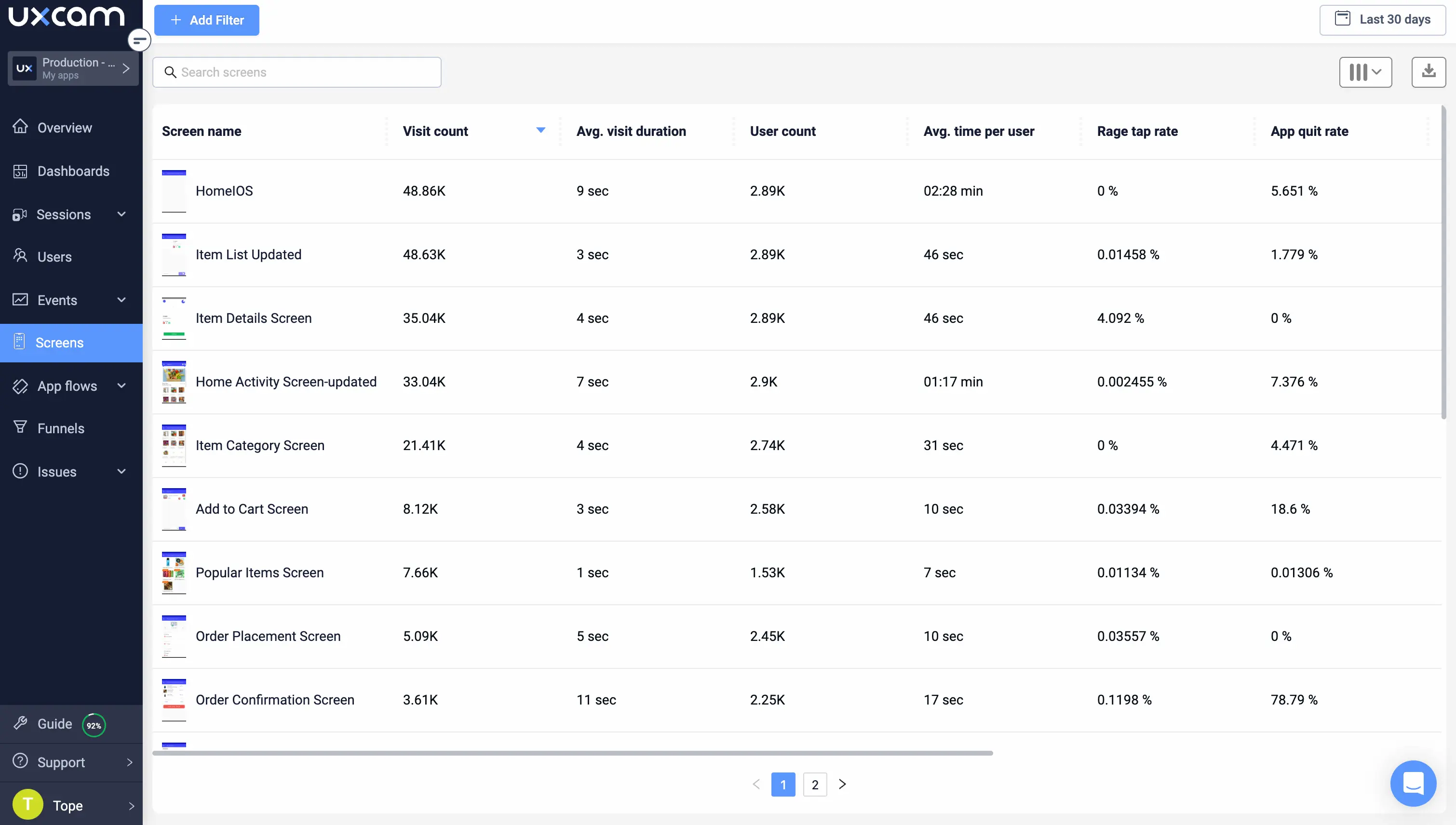 Navigating to the Screens will show you a list of app screens ordered by the number of sessions engaged with them.