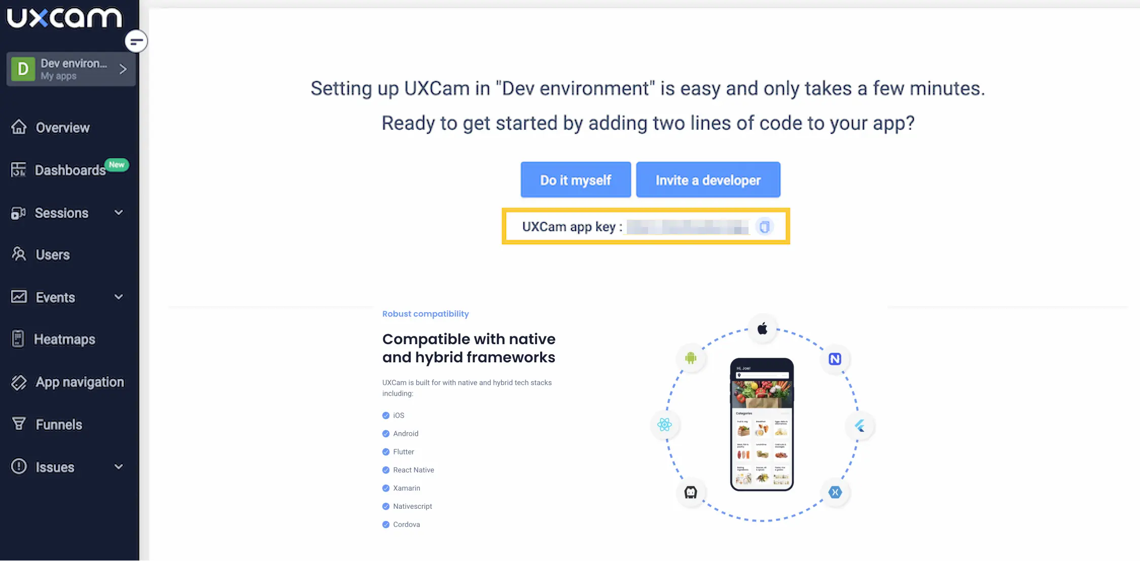 UXCam is an all-in-one mobile app analytics platform that offers heatmaps for apps created on a range of platforms, including: