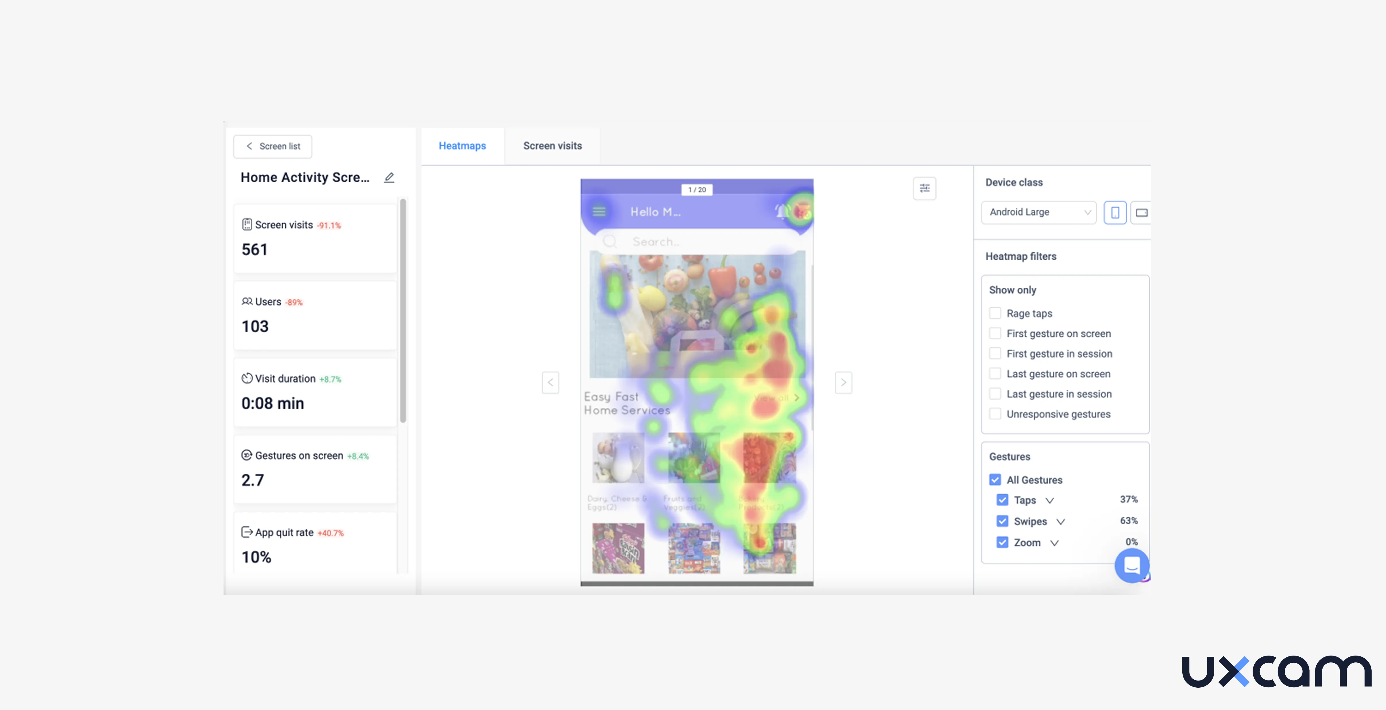 A React Native-specific heatmap tool, such as UXCam, is crucial for accurately tracking tap locations, gesture events, and screen interactions across all platforms. It surfaces inconsistencies quickly and allows you to detect UX friction points that would otherwise go unnoticed.