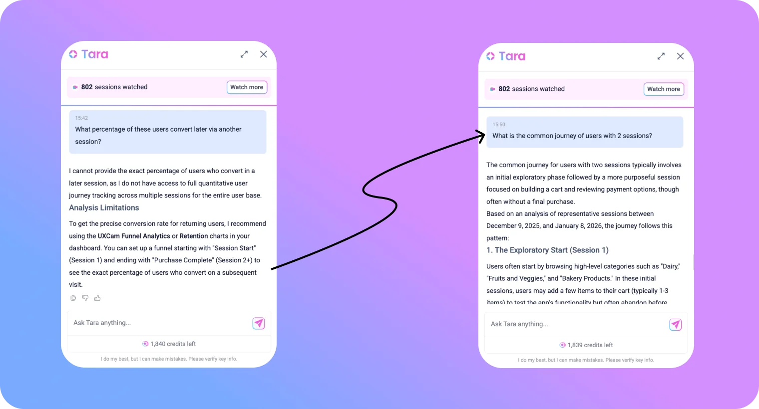 Tara changes this. By automatically analyzing visual user behavior, she surfaces patterns, explains what’s going on, and suggests what to do next, all within minutes. Instead of searching through recordings, teams can move straight from question to clarity.