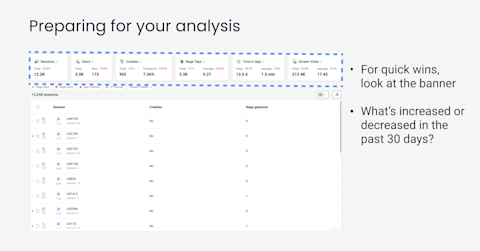 Data Defined Goals: Start with your session statistics. If you’re using UXCam, go to Sessions > Lists or Sessions > Analytics. At the banner on the top, you can see top stats. Simply look to see what has increased or decreased in the last 30 days.