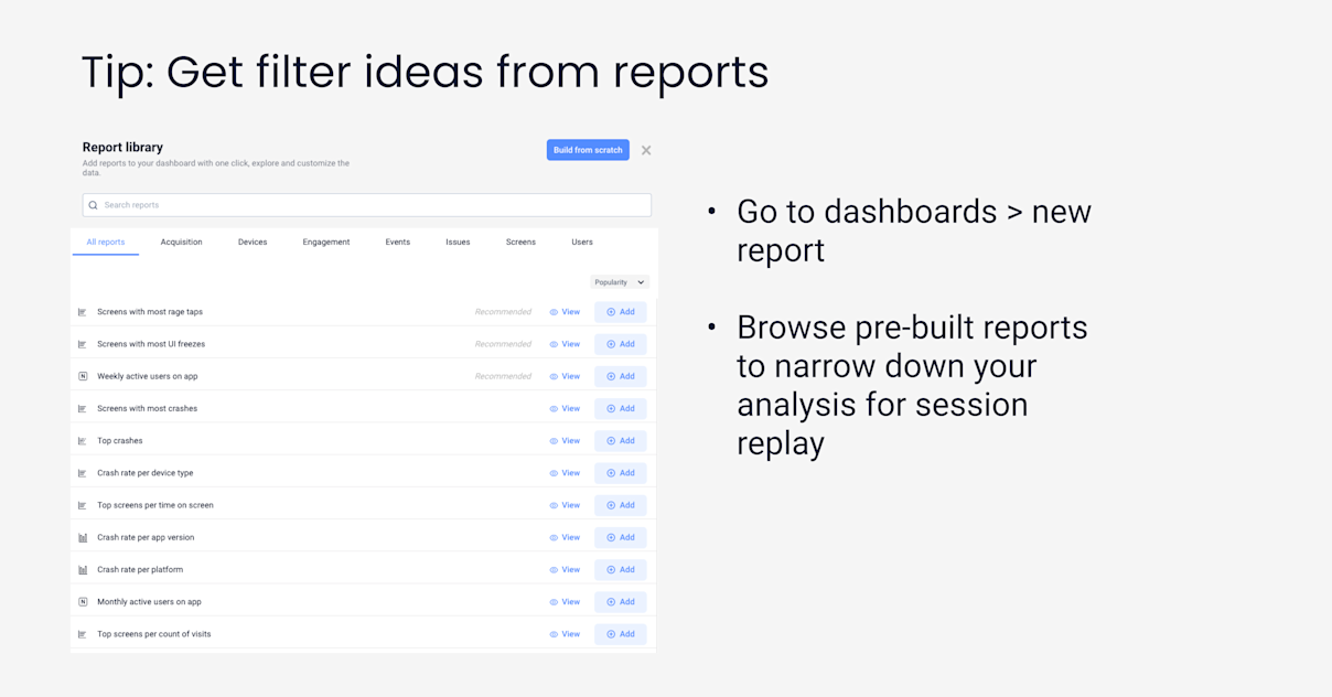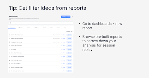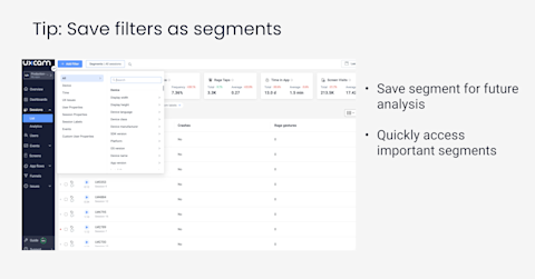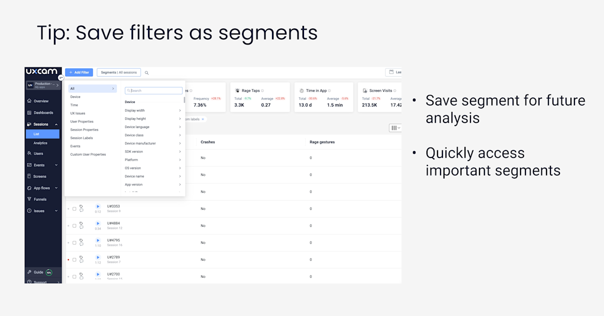 Other qualitative and quantitative tools can enhance your session replay analysis. Instead of watching all sessions on a single app version, you can slice up your data with other features.