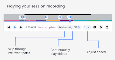 Over to the session recording video itself. At the bottom, you’ll see a player which will help you navigate through the sessions. The skip inactivity button means you only play the parts that have user interaction. The play all button enables you to continuously play sessions so you don’t have to continue clicking on the next session.