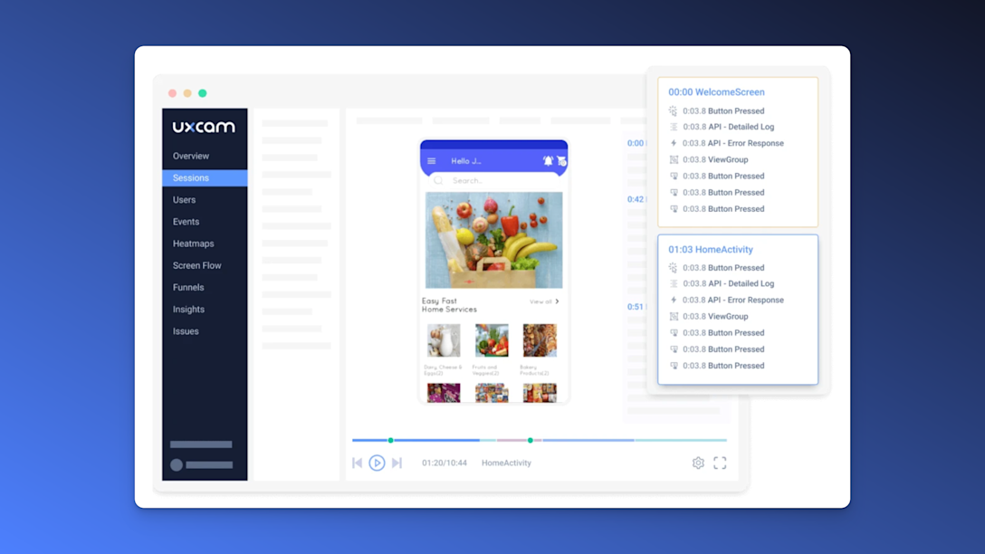 Session replays - Once you’ve decided which filters or segments to apply you can start analyzing your sessions and playing the videos. This gives you a more holistic understanding of the needs and drives of your user behaviors. You can send app logs to your development team to help them get the full context of the users' actions so you can improve their experience.
