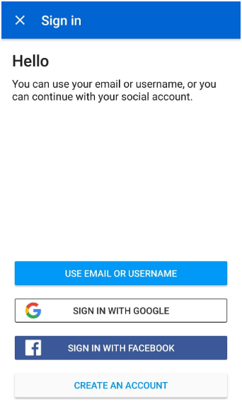 Unlike some of the examples above, you can’t log in with your Google or Facebook accounts, but it’s connected to your Microsoft account. The design is recognizable and still clear: there’s only one button to push on the first screen, hard to miss.