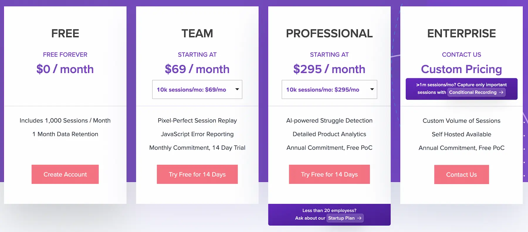 The Professional plan supports 10K to 1M sessions for both web ($295-$2,200/month) and mobile ($350-$2,645/month).