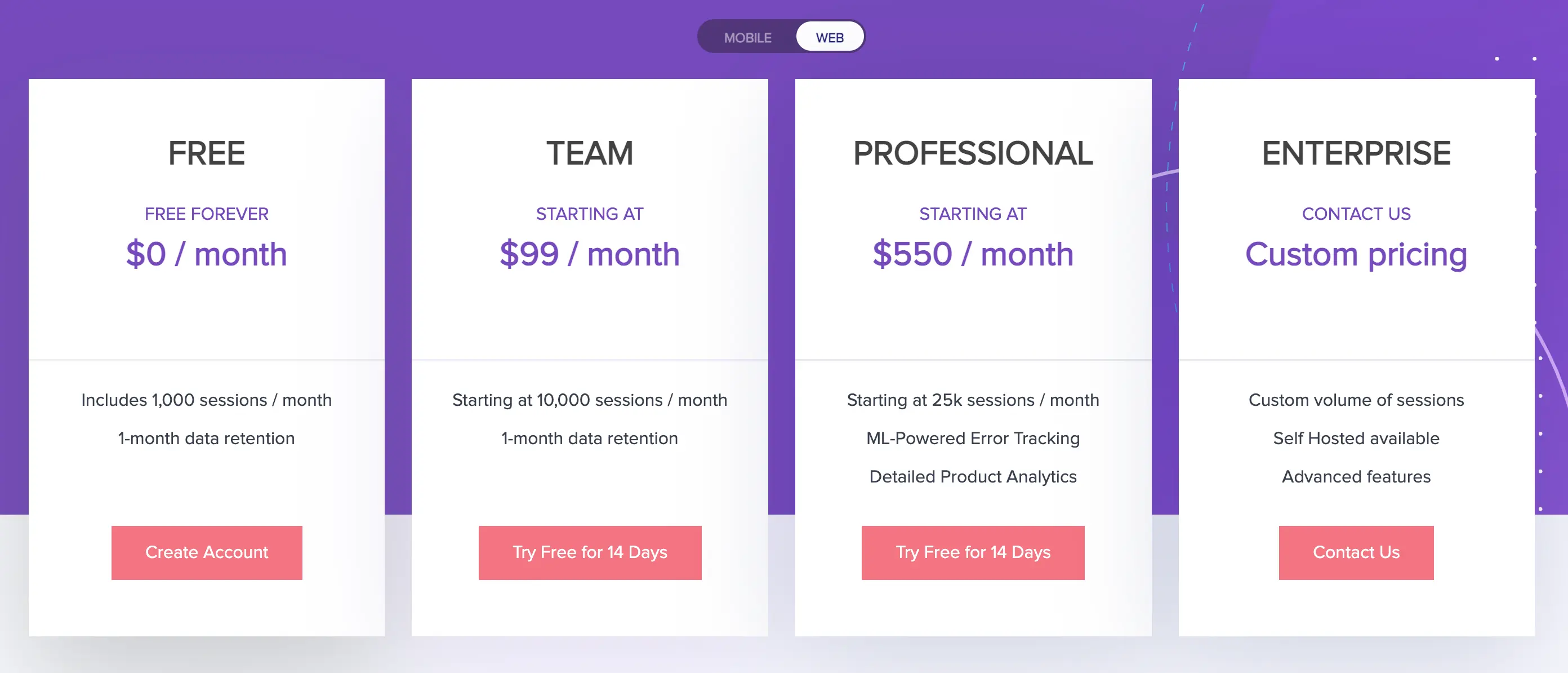 LogRocket has three priced plans, ranging from $99 - $460 per month for their Team and Professional plans. They also have a custom price plan, where you can talk to the team and pick-and-choose features which your company needs, which can help cut down on pricing. There’s also a free plan if you’re looking to test LogRocket’s features before putting down any money, though it is limited.