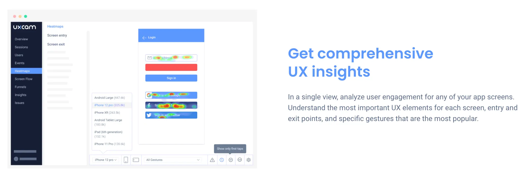 Utilize heatmaps to identify common user interactions across your app, including entrance and exit points, rage gestures, and the ability to pinpoint the most and least used features.