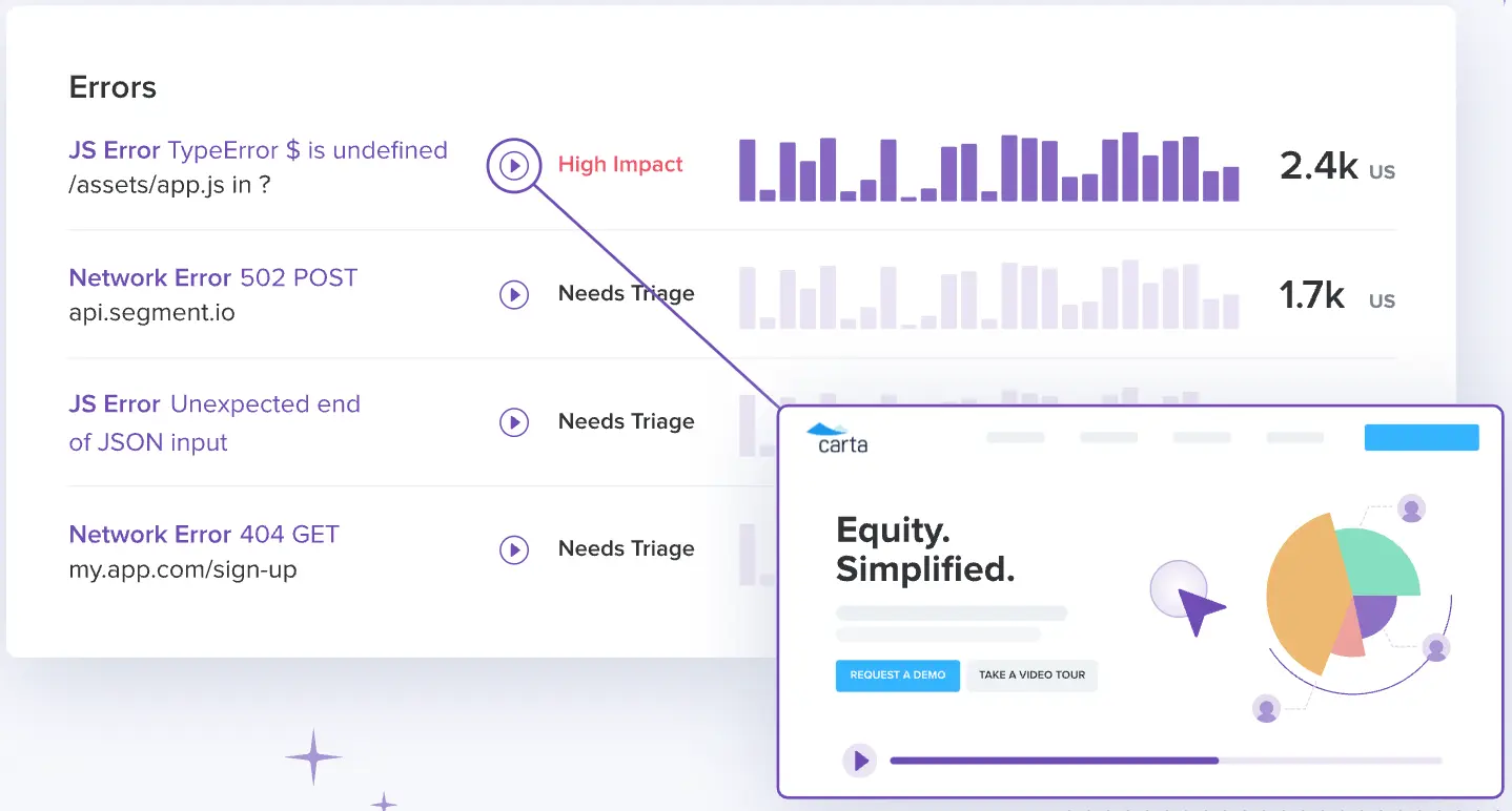 Logrocket also uses machine learning to help sort out the web of issues that result in noisy data, making it much easier to identify what’s actually causing a problem quickly.