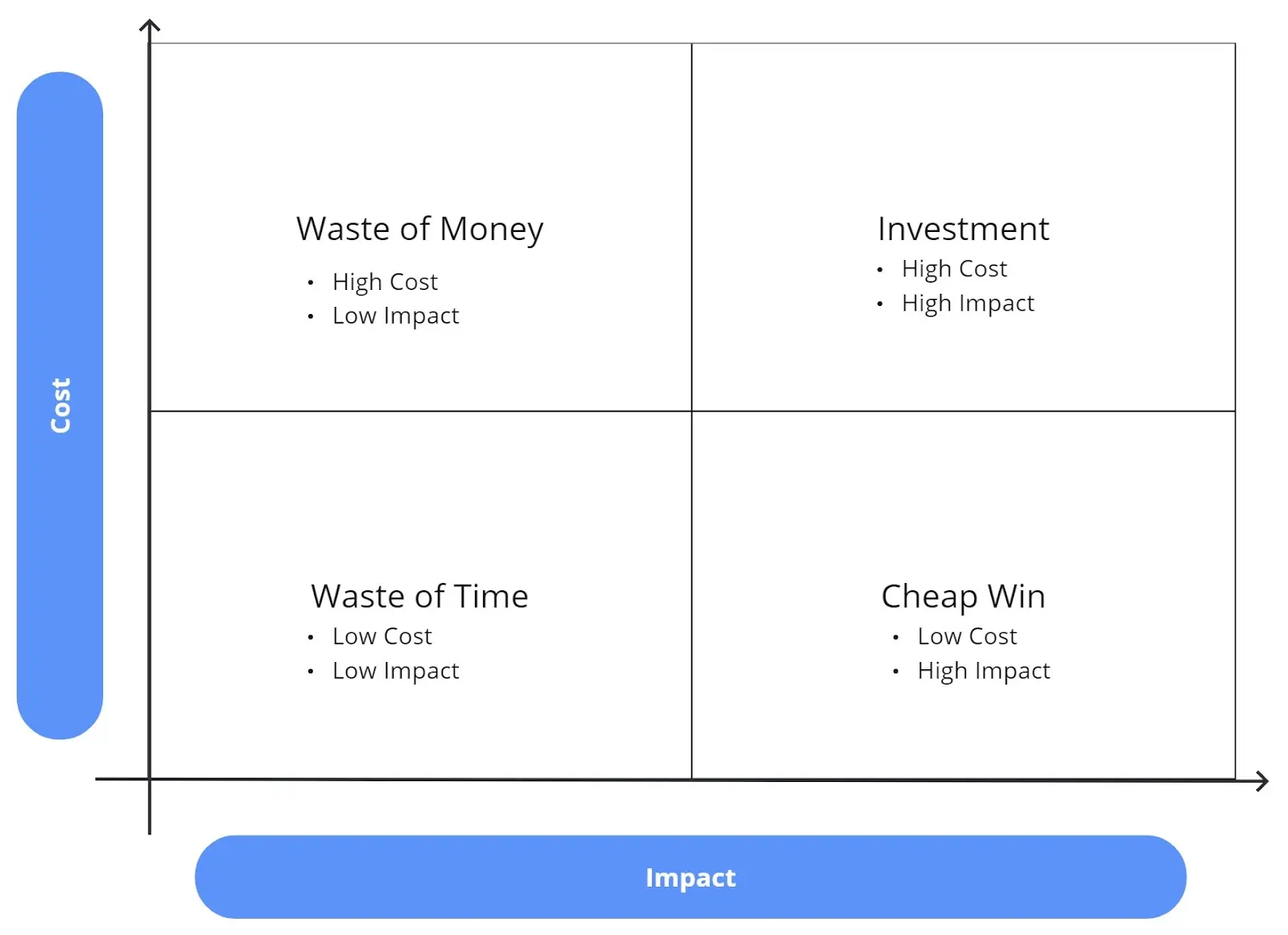 For example, an effort-impact matrix usually only takes effort and impact into account—but you can easily swap either effort or impact for cost. Alternatively, you can decide on a weight for each factor and use a weighted scoring system.