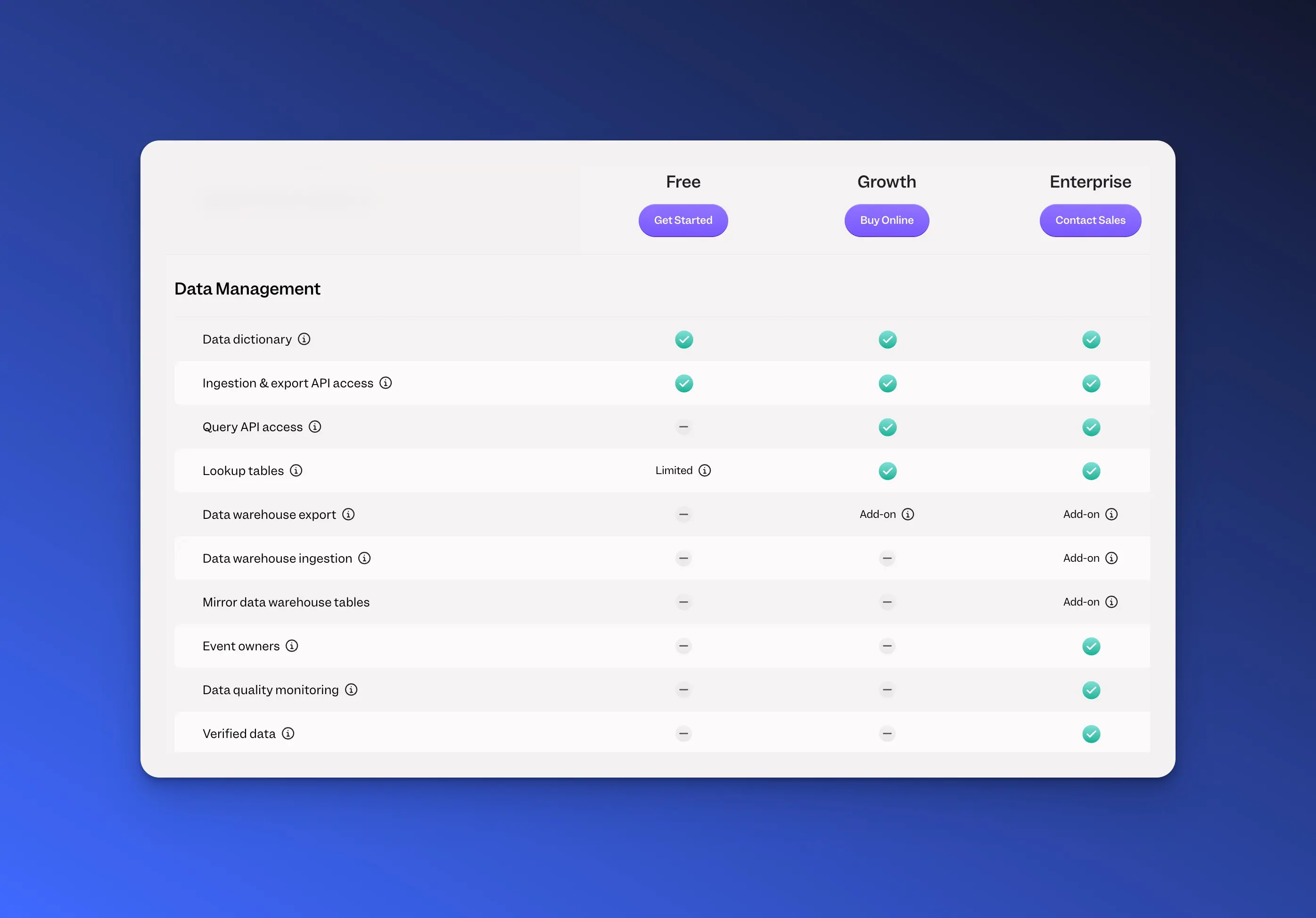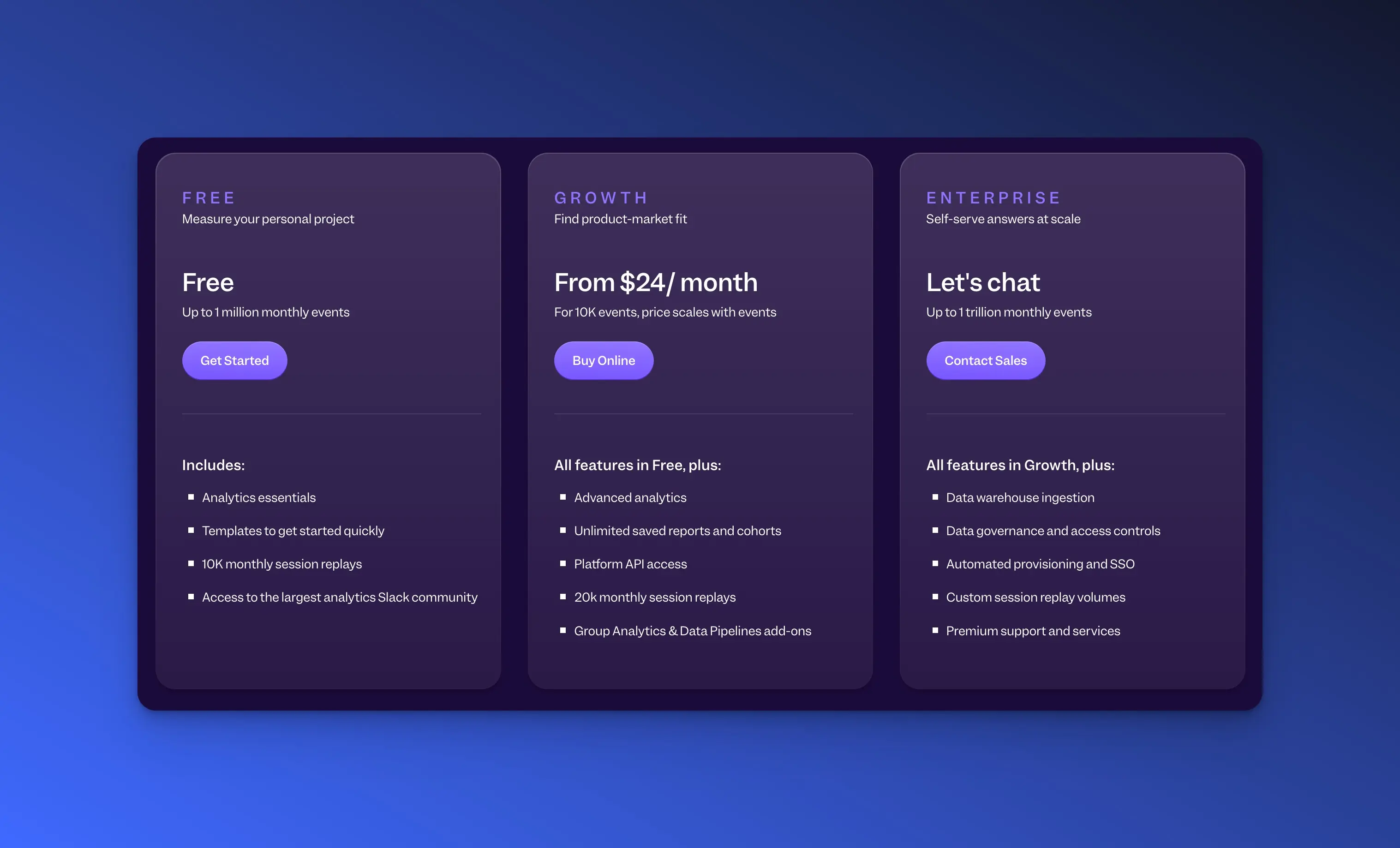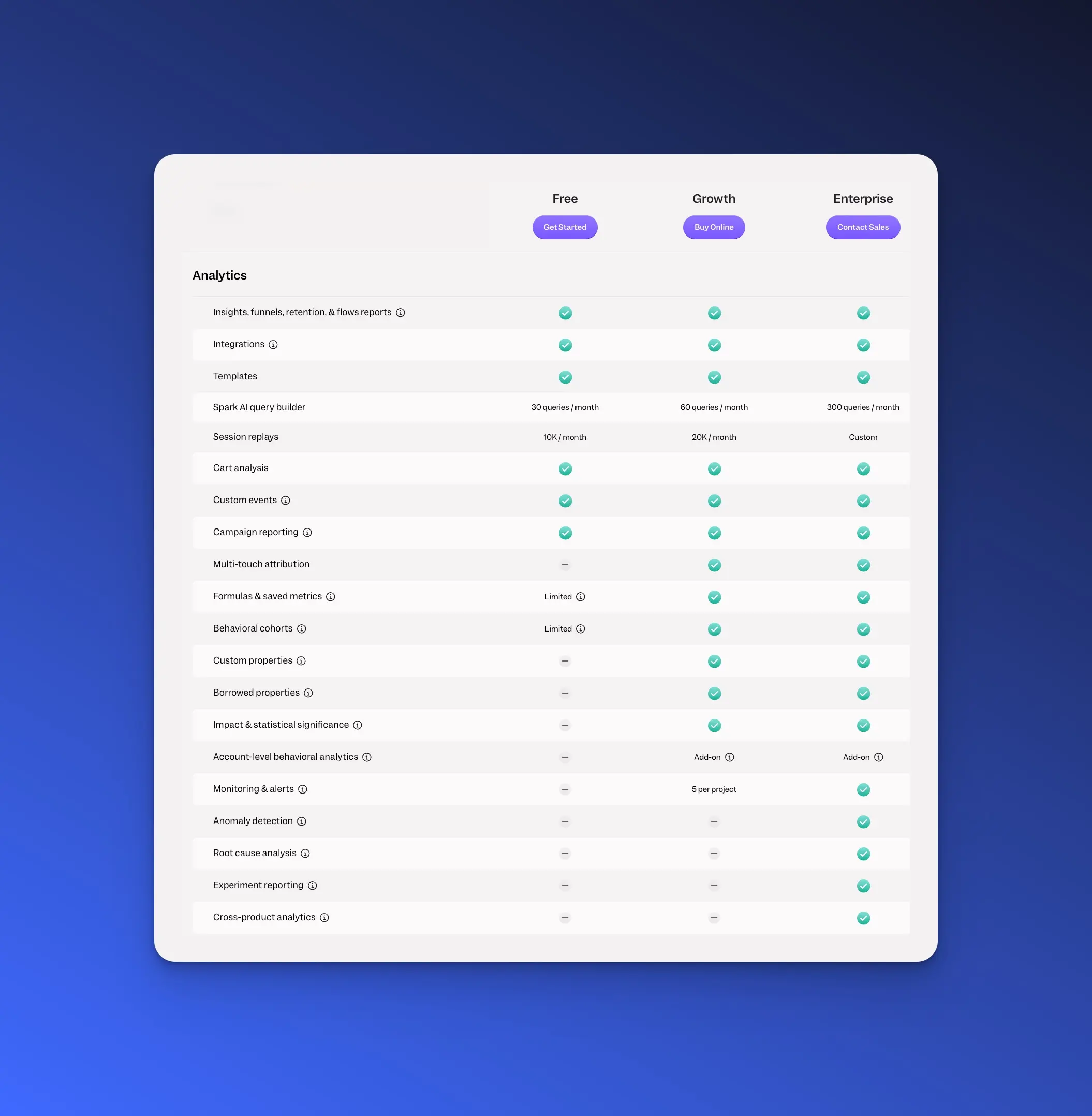 | Growth | Starting at $24/month | Scalable up to 20M events/month, unlimited saved reports, advanced analytics, some add-ons. |
