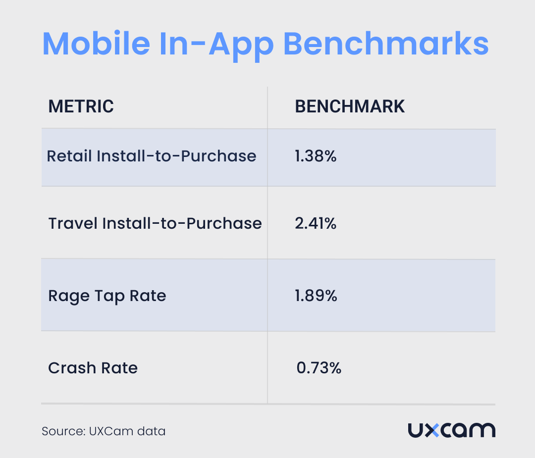 Install-to-purchase conversion rates: 1-2%. (Source: UXCam data)