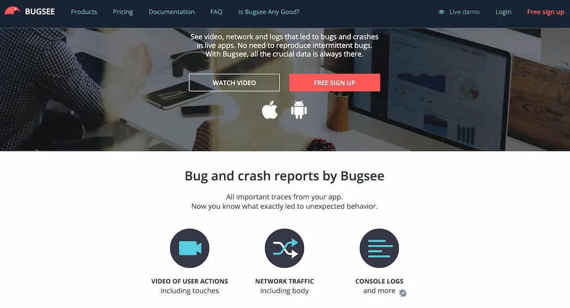 Bugsee is a crash reporting tool with a focus on simplicity. Case and point—you only need to write a single line of code to set up the tool.