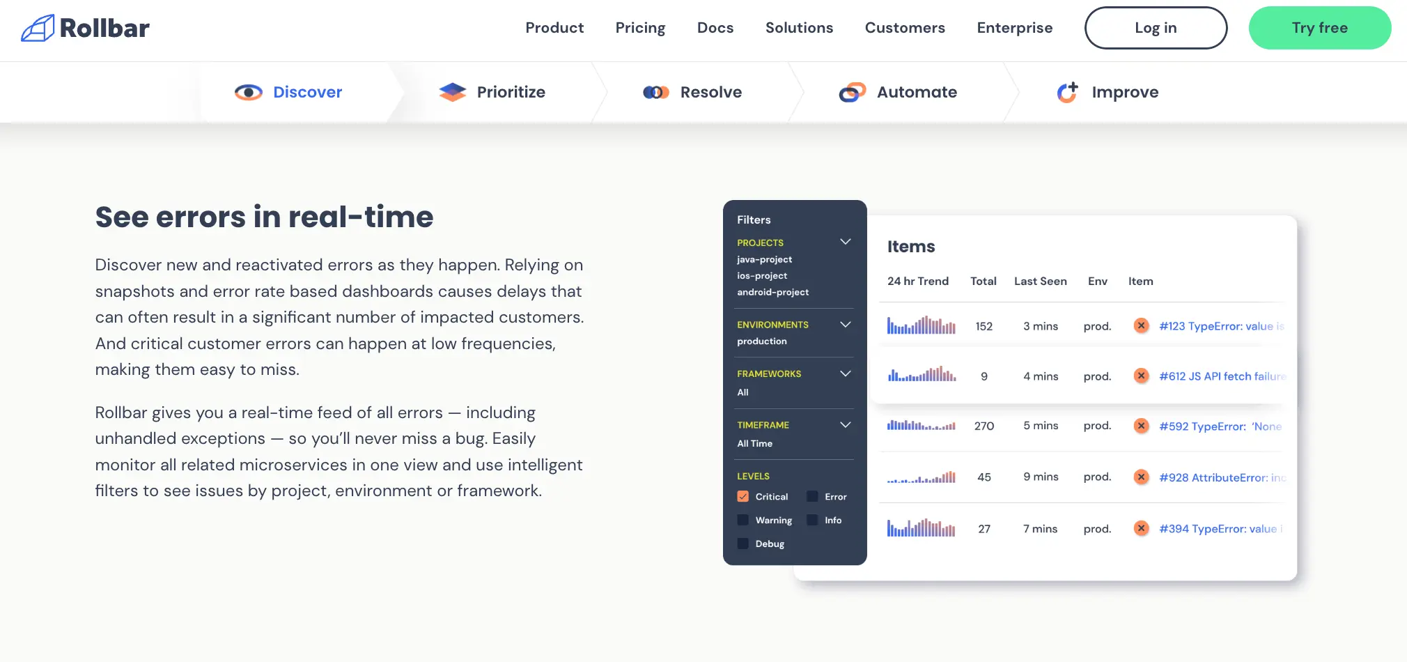 Automated Grouping: Rollbar automatically groups similar errors together to make it easier to identify patterns.