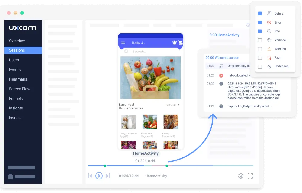 It provides you with detailed insights into errors and crashes, plus offers real-time alerts when an issue occurs. UXCam also matches every crash report to tracked sessions, meaning you can get an instant replay of exactly what happened—perfect for getting contextual insights from the data. This allows you to recreate the exact conditions that caused the app to crash in the first place, which is crucial when testing whether a bug has been fixed.